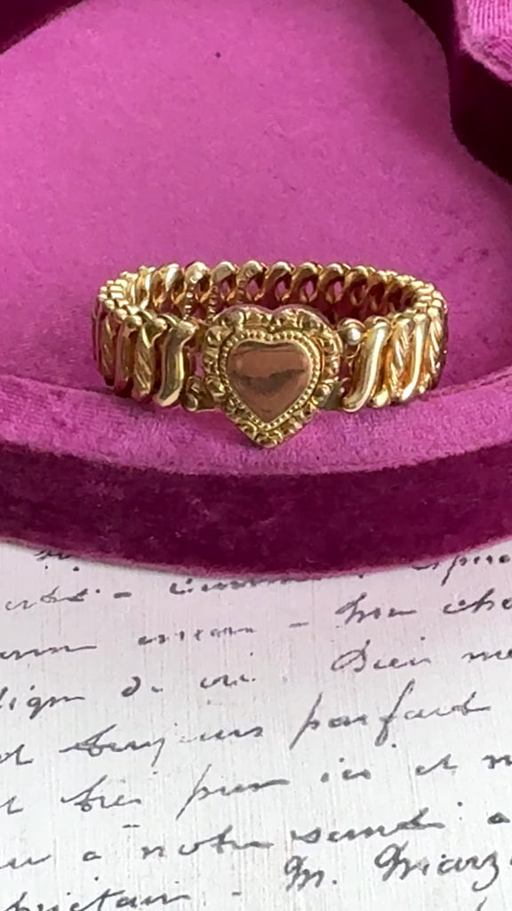 This gold-filled expansion bracelet features a softly engraved heart plaque framed with delicate beaded detail and smooth, sculpted links. Its warm gold tone has aged beautifully, developing a gentle patina that speaks to its history.