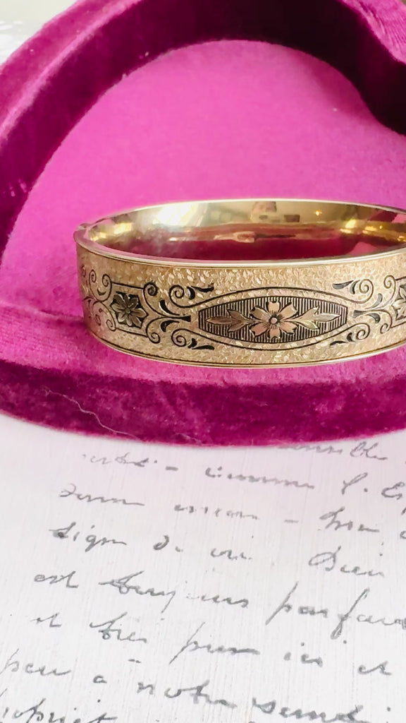 This gold-filled hinged bangle by Winard features the distinctive Taille d’Épargne technique - fine black enamel tracing ornate hand-engraved patterns across the surface. The combination of delicate scrollwork, floral accents, and rich contrast gives this piece its refined, graphic look.