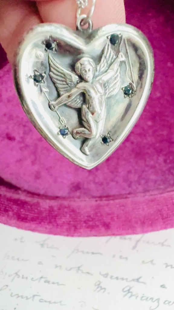 This sterling silver pendant features a raised cupid design at the center - detailed wings, bow in hand - surrounded by a finely etched starburst pattern that gives the piece subtle dimension and movement. The paste-set stones bring a soft texture and understated sparkle,