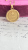This French love token necklace is all about quiet romance and clean lines. The round 18k gold medal is framed with a floral wreath border and inscribed with the classic French phrase “Qu’hier, que demain” – shorthand for “I love you more than yesterday, less than tomorrow.”