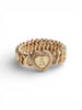 This gold-filled expansion bracelet features a heart-shaped locket with an engraved “A” monogram at its center. The raised edge detailing and wave-style links add dimension and texture. The locket opens to reveal space for a tiny photo or note.