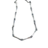 A mid-century design by Erika Hult de Corral, known as RIC. This sterling necklace juxtaposes dotted “moon-crater” spheres and elongated bars. This piece is marked Ric, Taxco SA, Hecho en Mexico and 925